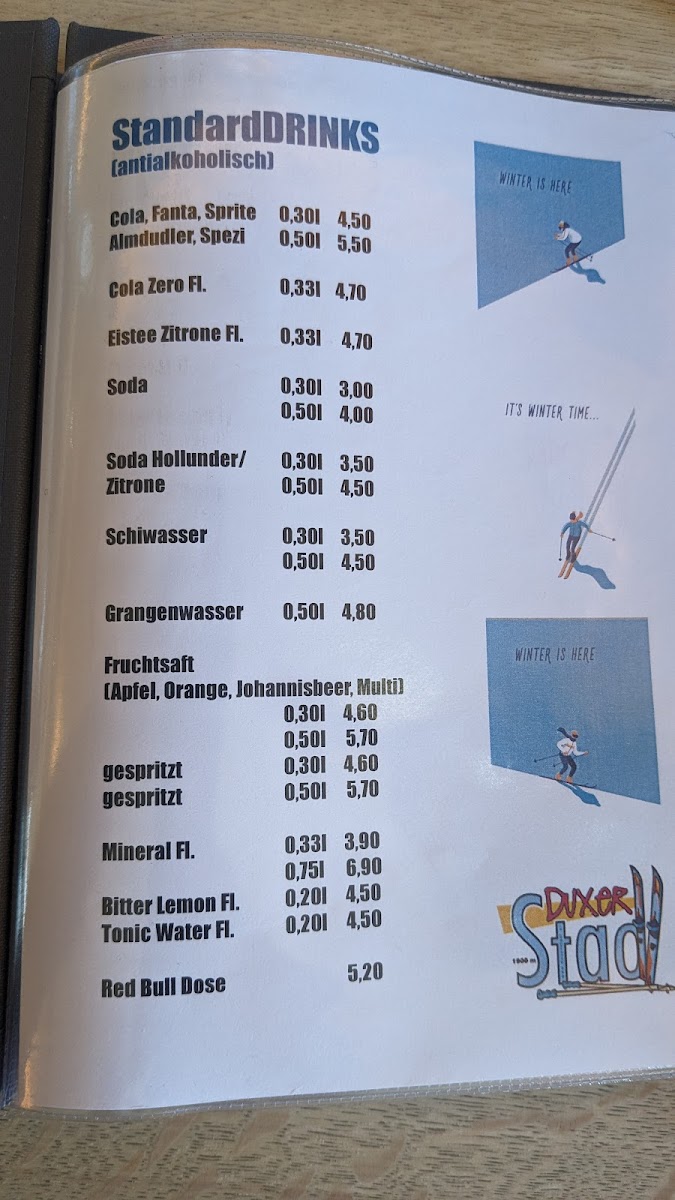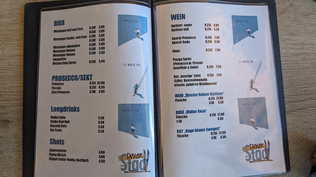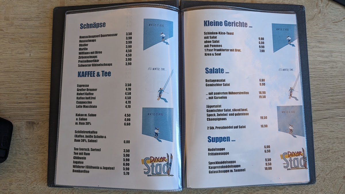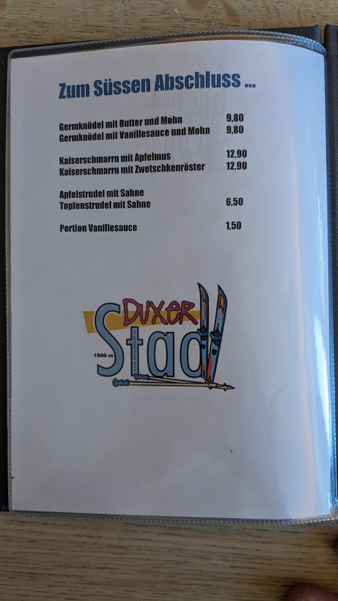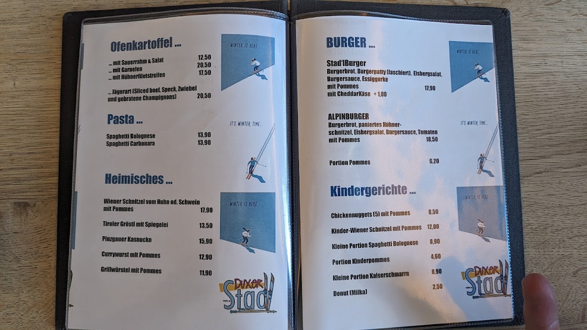 The Duxer Stadl Menu offers a delightful variety of dishes that cater to both hearty appetites and lighter cravings. Nestled in the heart of Hochkrimml at 159, this charming Austrian spot blends tradition with innovation, bringing together local ingredients and flavors in every bite. Whether you're in the mood for a savory schnitzel, a comforting bowl of soup, or a fresh salad to brighten your day, there's something for everyone. For those with a taste for bold flavors, the menu also features a range of grilled meats and specialties, each prepared with care. And, of course, no meal is complete without one of their decadent desserts or a refreshing local drink to wash it all down. Perfect for a cozy meal with friends or a casual family gathering, the Duxer Stadl Menu is sure to satisfy your cravings and leave you coming back for more.